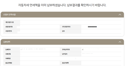 검색 버튼 클릭 ㅡ>차량정보와 납부세액 맞는지 확인 ㅡ> 신청 버튼 클릭 ㅡ> 즉시납부 버튼 클릭.