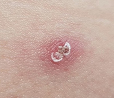 진드기의 유충이 사람의 피부에 붙어 피를 빨아먹은 부위에 가피(딱지)가 동반된 궤양이