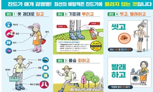 ● 예방을 위해서는 위험한 환경에 노출을 하지 않게 야외활동이나 작업 시에 진드기에 물리지